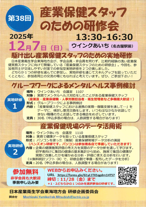 日本産業衛生学会東海地方会より 第38回産業保健スタッフのための研修会のご案内がありました。