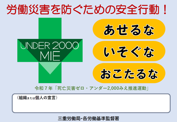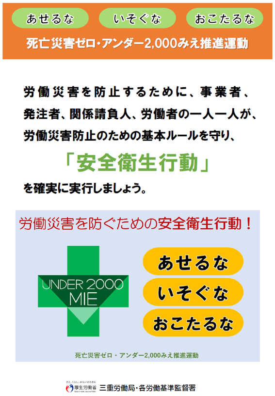 死亡災害ゼロ・アンダー2000みえ標語「あせるな・いそぐな・おこたるな」リーフレット(PDF)