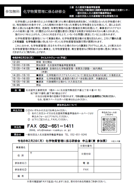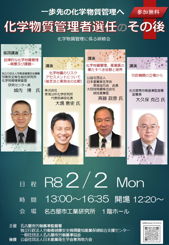 愛知産業保健総合支援センターより、化学物質管理に係る研修会のご案内がありました。